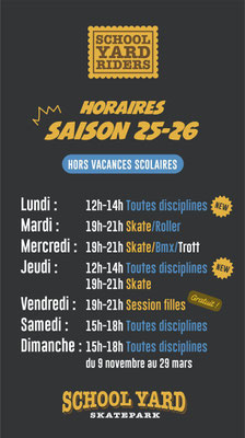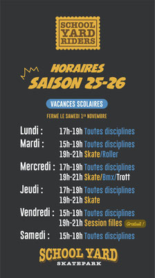 Ci-dessous les horaires d'ouvertures hebdomadaires dédiés à la pratique libre assurés lors de la saison 2024-2025. Reprise de ses horaires en septembre 2025 pour le début de la prochaine saison avec des créneaux supplémentaires